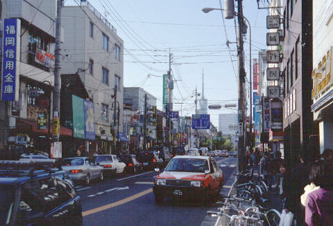 大宰府線は福岡からの直通と二日市折り返しの2系統をあわせてに15分おきに走っているので便利。五条駅はなかなかしゃれたつくりであった。駅前のバス停には「まほろば号」とかいうパステルグリーンのボディのやたらと全長の短いバスが立て続けに走ってきた。駅舎やそれらの写真を撮りすぐさま折り返し福岡に戻る。 お膝元を歩く夕方、福岡に戻ってきた。これで、現在知る限りリフラブと関連する西鉄の駅は一通り巡ったことになる。後は飛行機に乗るまでの間リバーヒルソフト社がある早良区付近をブラブラ歩くことにする。リフラブ内で出てきた建物はこのあたりにあるのではないか、という読み(大甘)だ。 早良区でも百道浜は89年にアジア太平洋博覧会が行なわれた後にビル群が林立した、いわばバブルが浜なのでリフラブの世界とはちょっとちがう。 まぁ高宮ビルのモデルはありそうだが、今日のところは西新の商店街を歩いてみることにした。天神から西新までは地下鉄が利用できるが、例によって西鉄バスを使う。わざわざ地下まで降りていかなくてもいいし、なにせバスのほうが本数が圧倒的に多いのだ。 西新の岩田屋の前の人だらけの停留所でバスを降り、西新5丁目付近をブラブラと歩く。