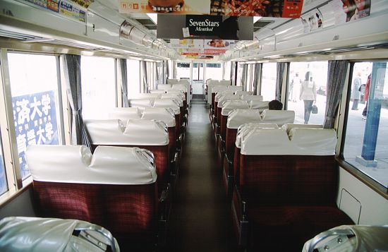 運転台次位の大きな固定窓と扉間の連続窓が良好な展望を提供します。運転室次位の座席も転換クロスシートなので前面展望が楽しめます。