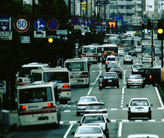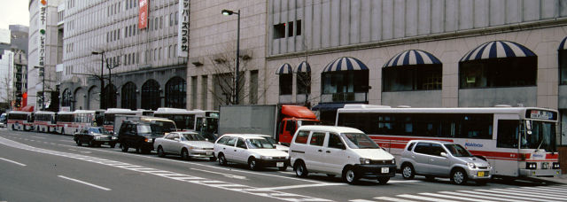 西鉄バス渋滞が起こる天神三越前、大丸前、バスセンター付近。
