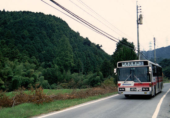 椎原川沿いを走る西鉄バス。西鉄バスというと大通りを大挙して走っている印象が強いだけに違和感があります。