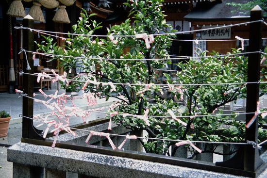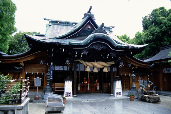 あと少しで午前10時になるが、実は今日の福岡は朝から雨。それも断続的に激しく降ったりしている。名古屋地方は晴れていたためとても「傘」という発想がなく当然持ってこなかった。傘がなくては戦はできぬわけで、どうせ買うならしっかりしたのを買おうと、博多駅併設の井筒屋が開店するまで駅のコンコースで時間をつぶす。 ファンテーンシティと神社
