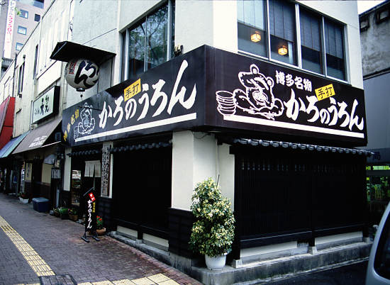 それにしても相変わらずのデートスポットぶりで、多少気分が「ケッ」となったところでキャナルシティのまん前にある博多名物「かろのうろん」で昼飯を食った。この店はガイトブックにも載る有名店だが、店自体は古くから地元に愛されているただのうどん屋(「角のうどん」の博多なまりが「かろのうろん」だそうで)である。